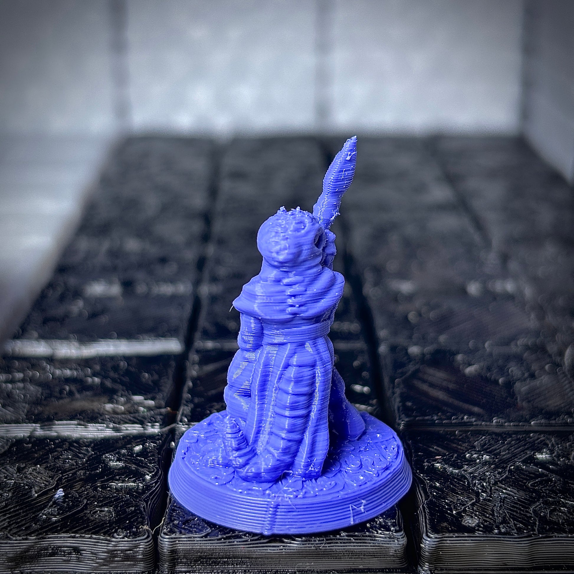 Nossas miniaturas são impressas em PLA (Ácido Polilático), um material biodegradável, resistente e ideal para impressão 3D. Diferente da resina que é um material tóxico feito à partir de epóxi e que emite fumos que causam câncer, o PLA é feito a partir de fontes renováveis e amido de milho, e suas impressões são construídas camada por camada, o que cria um visual característico com leves linhas visíveis na superfície.