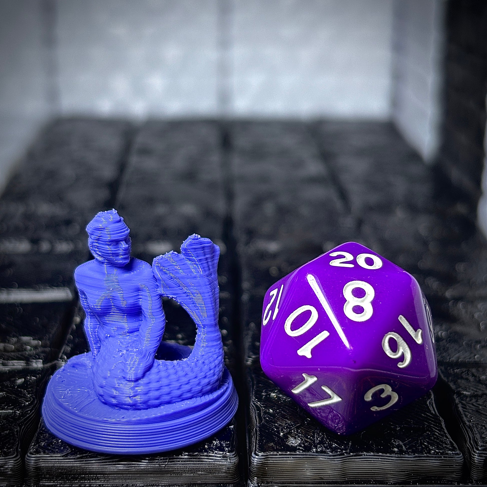 Nossas miniaturas são impressas em PLA (Ácido Polilático), um material biodegradável, resistente e ideal para impressão 3D. Diferente da resina que é um material tóxico feito à partir de epóxi e que emite fumos que causam câncer, o PLA é feito a partir de fontes renováveis e amido de milho, e suas impressões são construídas camada por camada, o que cria um visual característico com leves linhas visíveis na superfície.